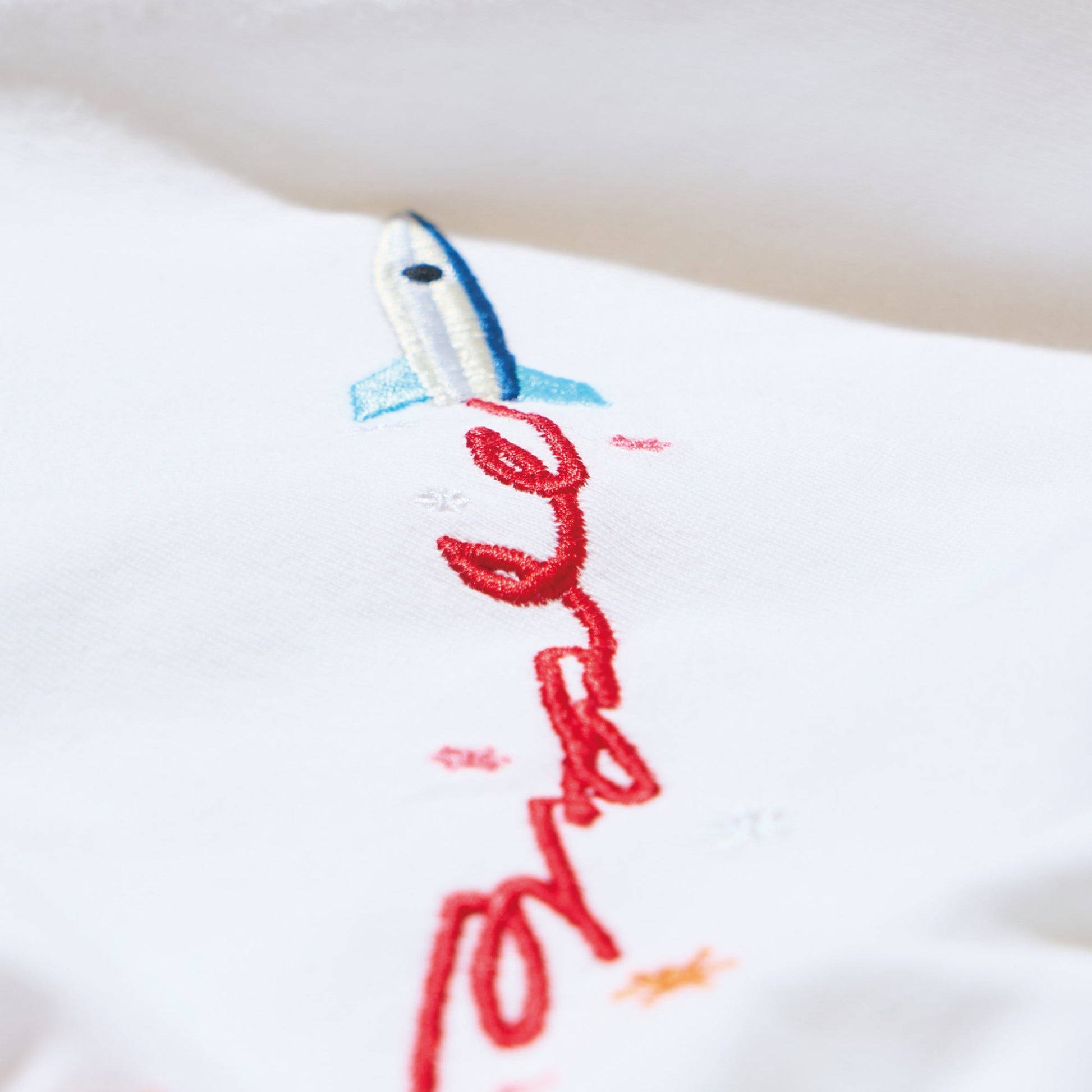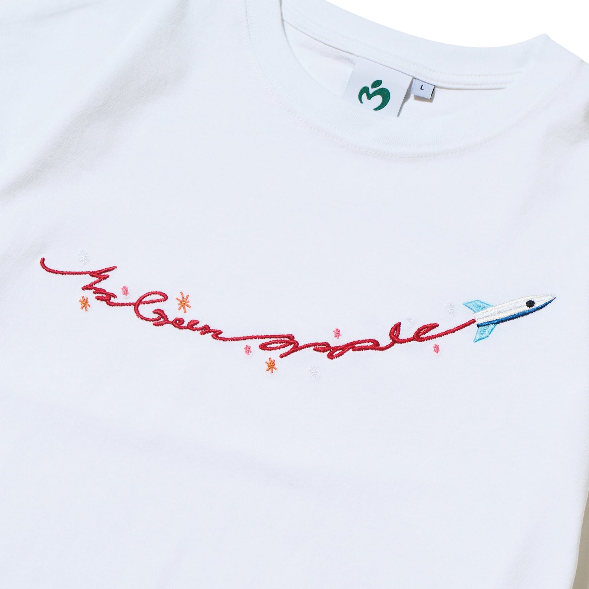The rocket motif and the artist's name in the shape of a ship's track are embroidered.