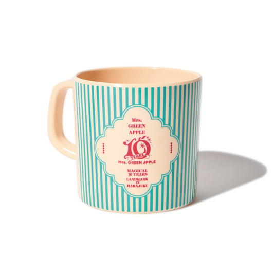 블루그린 스트라이프 무늬에 LANDMARK IN HARAJUKU와 10주년 로고가 새겨진 머그컵입니다.