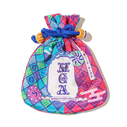 バイカラーの和柄模様に、MGAと10周年ロゴを配した巾着。