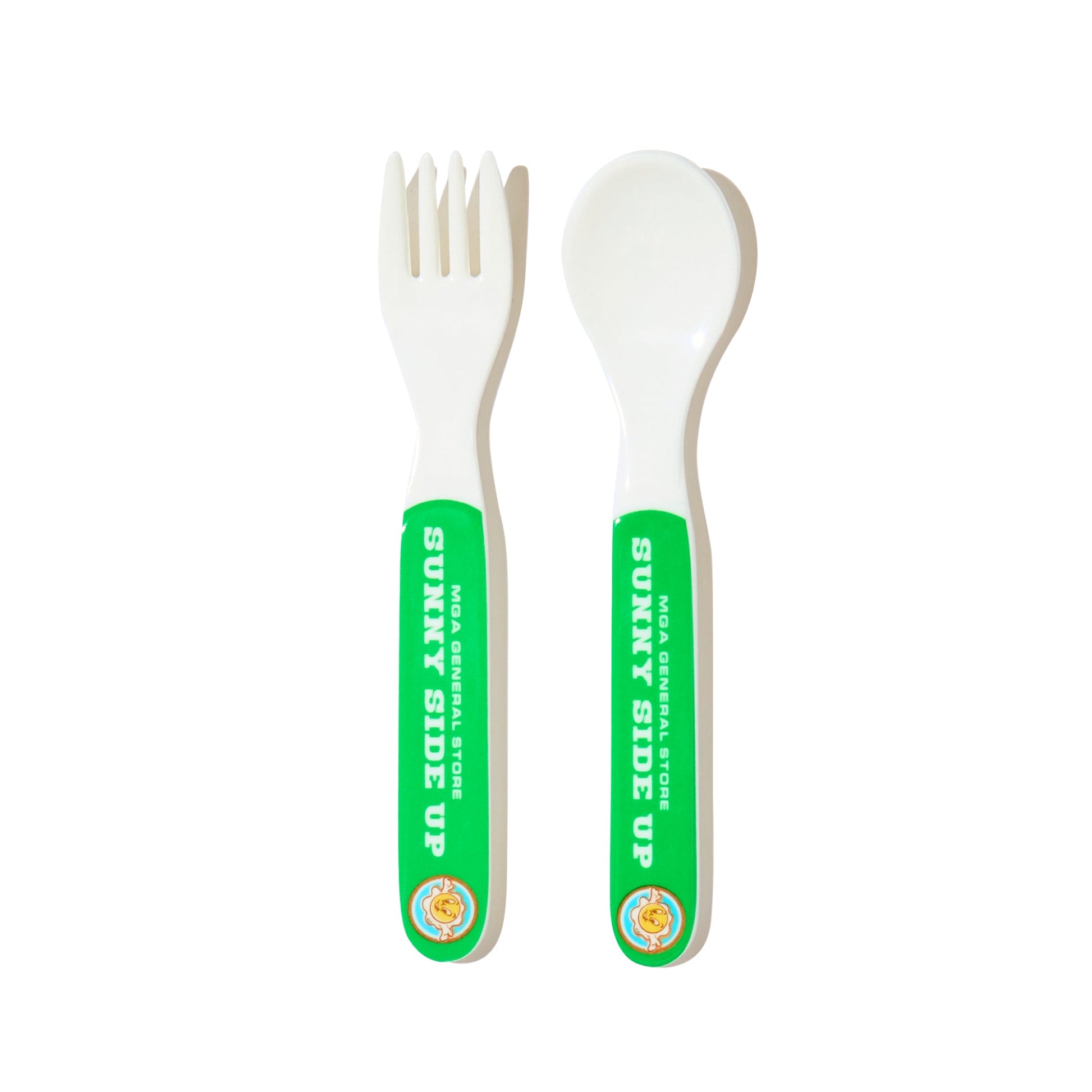 いつもの食事が楽しくなる!「SUNNY SIDE UP」ロゴをほどこした、スプーンとフォークの緑色がPOPなカトラリーセット。