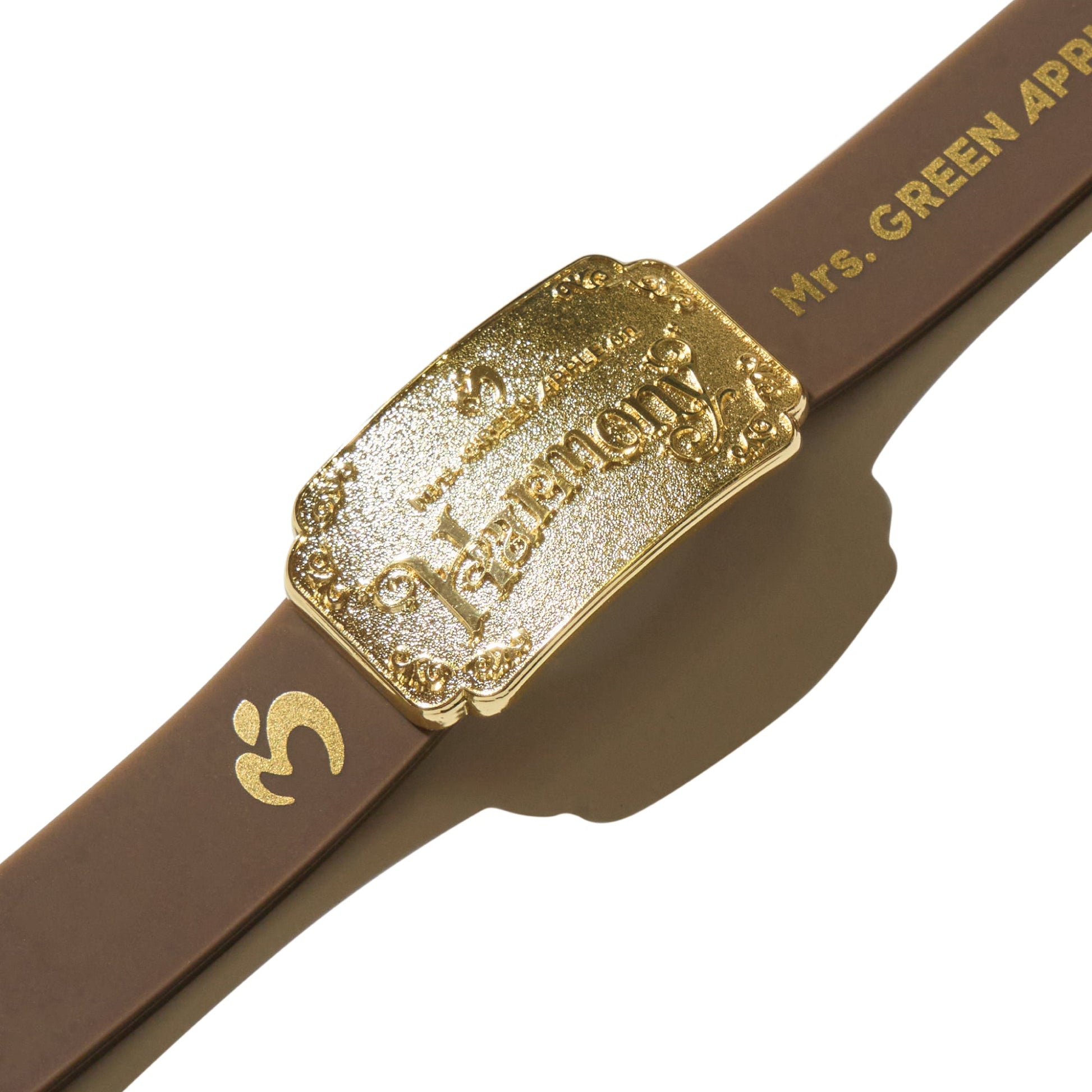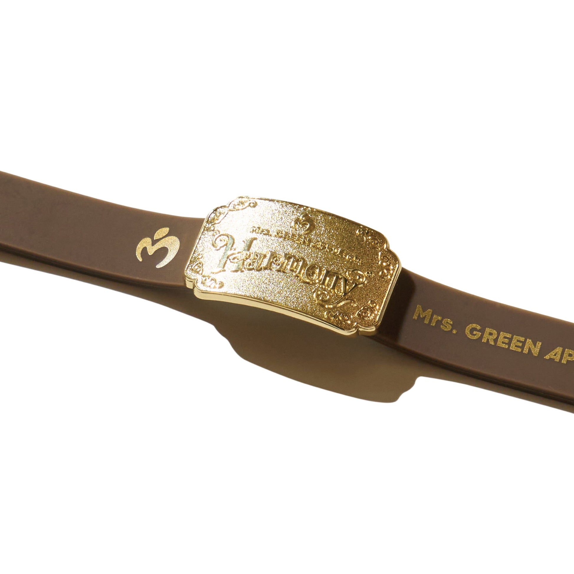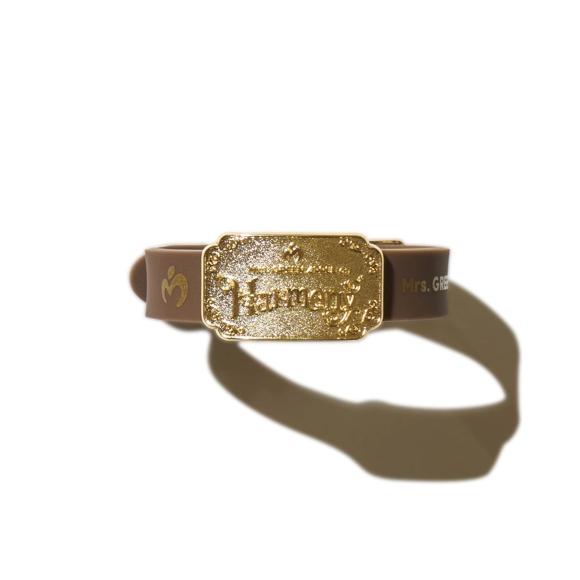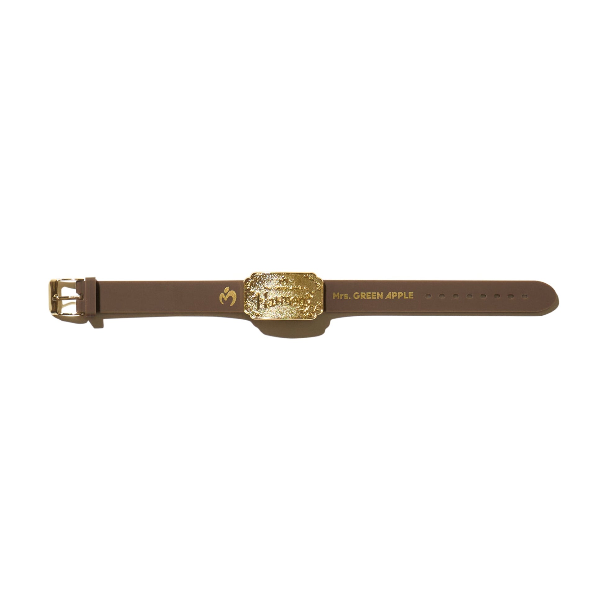 ラバー素材のバンドに、ロゴが刻印されたプレートが印象的なブレスレットです!