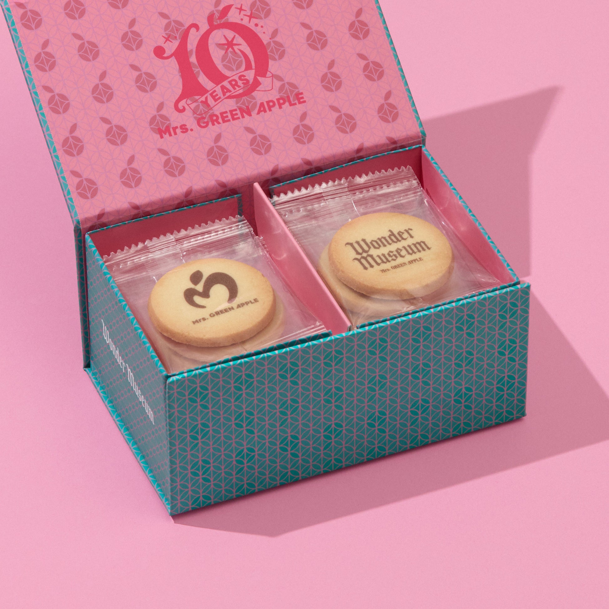 Mrs. GREEN APPLEロゴと、Wonder Museumロゴの、2種類のプリントクッキーが4枚ずつ計8枚入っています。