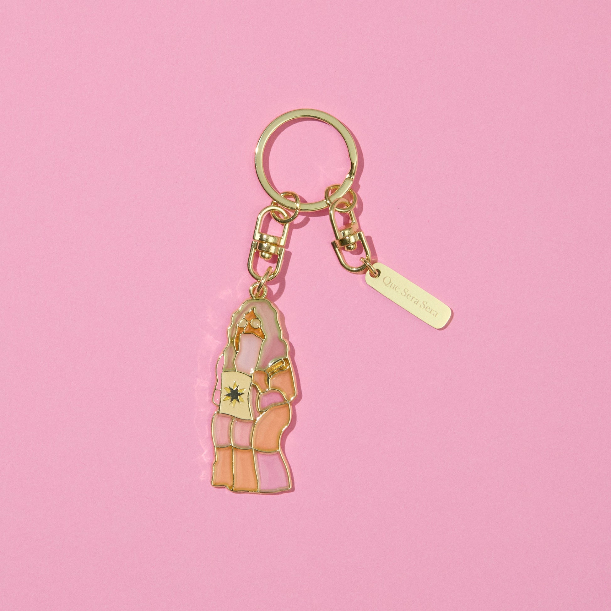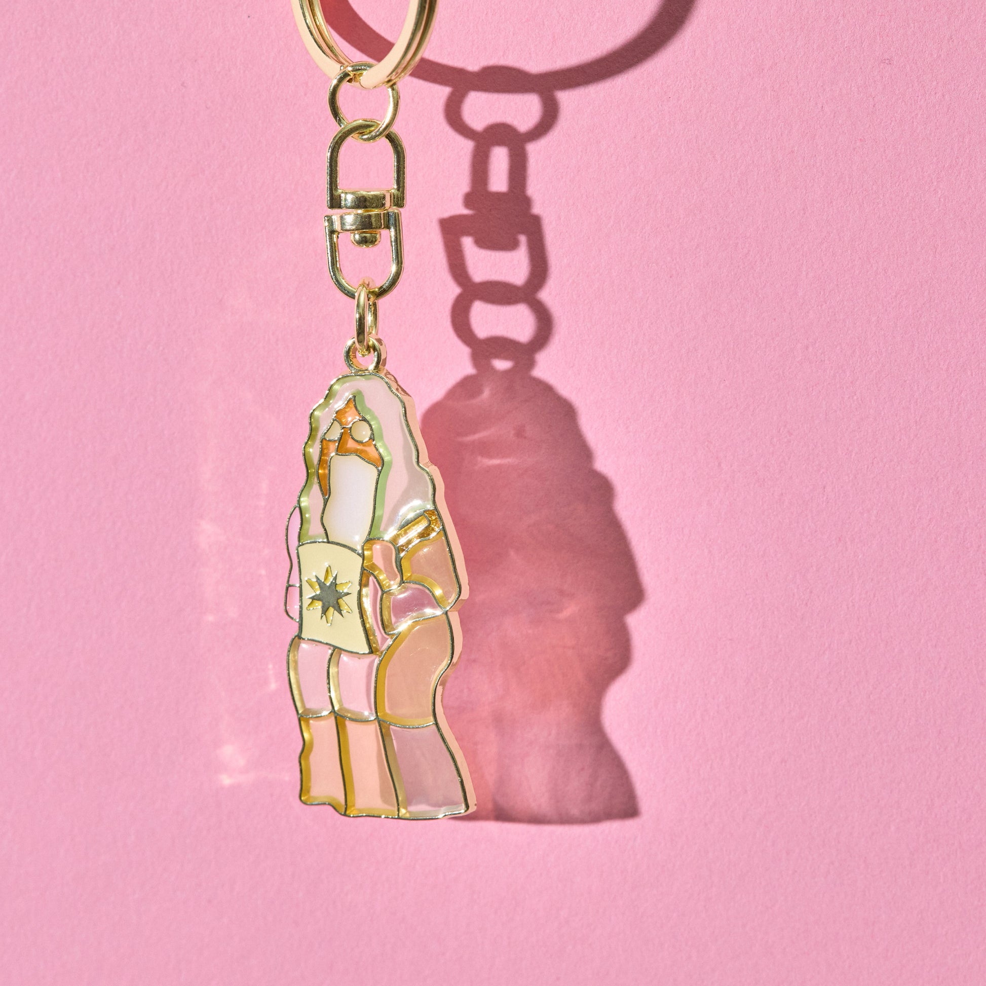 Mrs. GREEN APPLEの楽曲「ケセラセラ」のミュージックビデオに登場する神様を、ステンドグラス風に仕立てたキーホルダー。